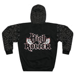 e front pocket, a hood with a drawstring, and is custom cut and sewn.